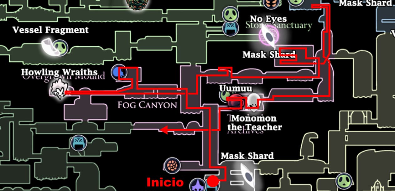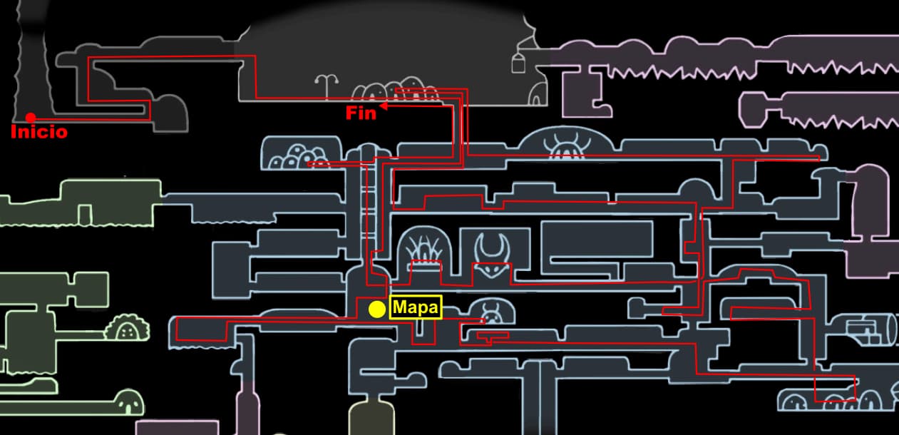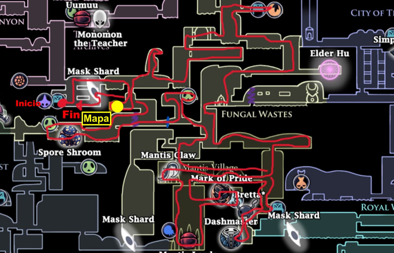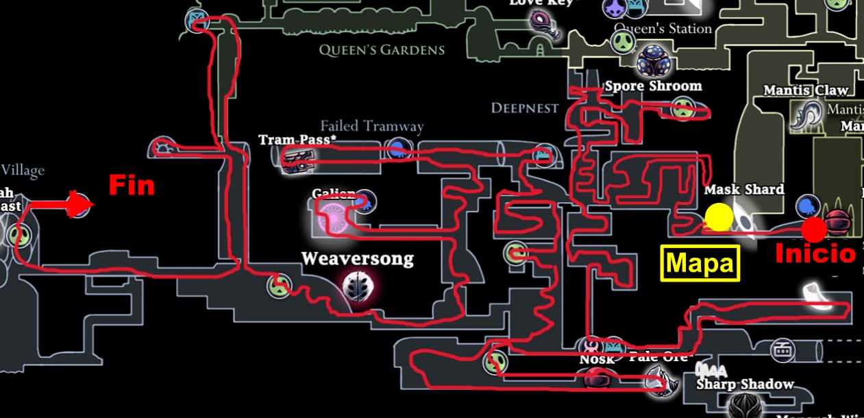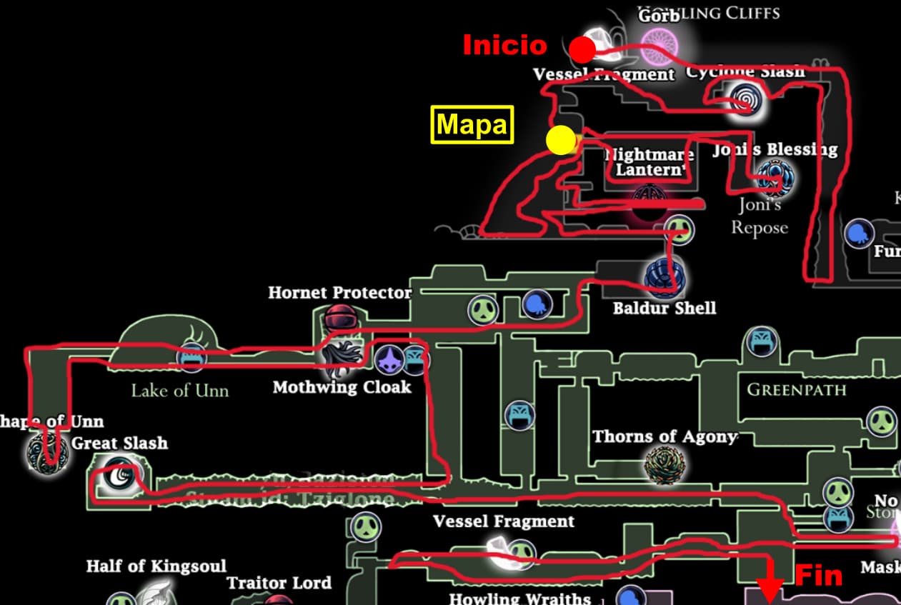 Durante esta travesía vamos a encontrar varios Grubs, fragmentos de mascara e incluso una mejora de habilidad (La Oscuridad descendiente).