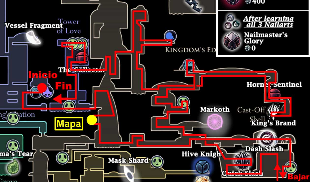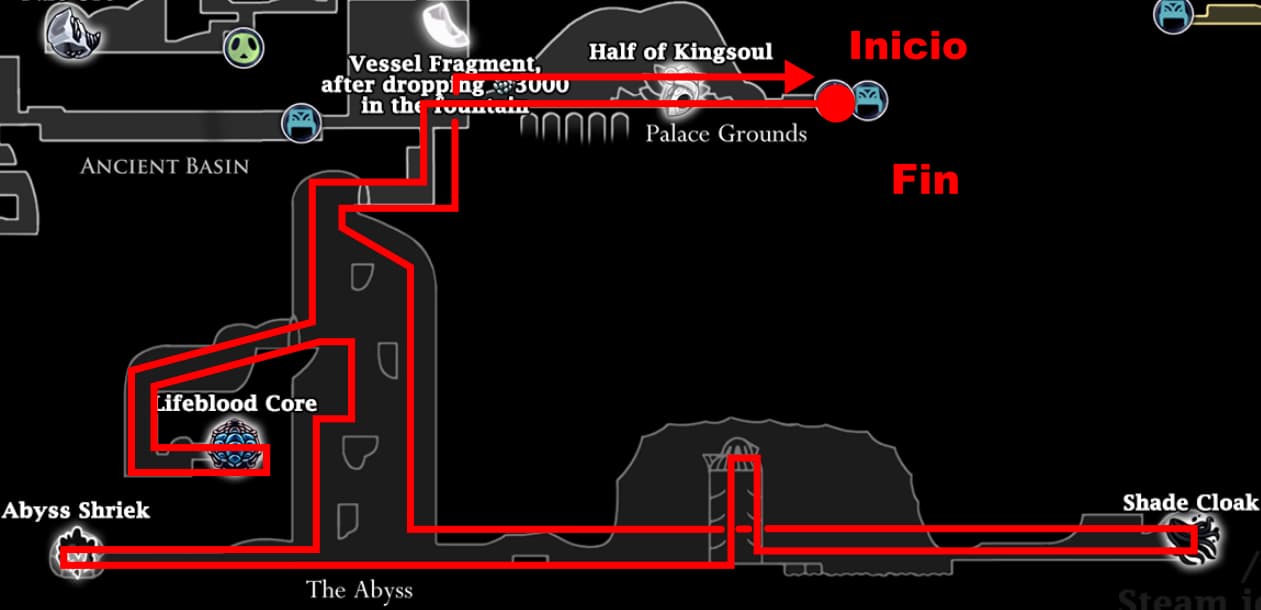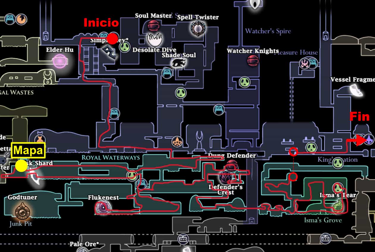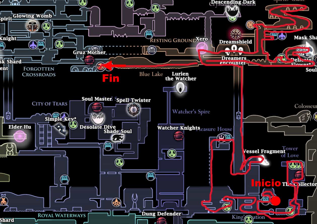 Durante esta travesía vamos a encontrar varios Grubs, fragmentos de mascara e incluso una mejora de habilidad (La Oscuridad descendiente).