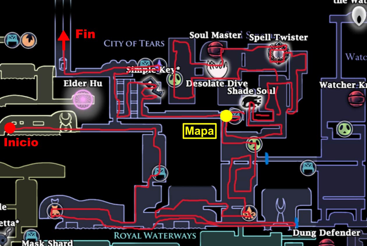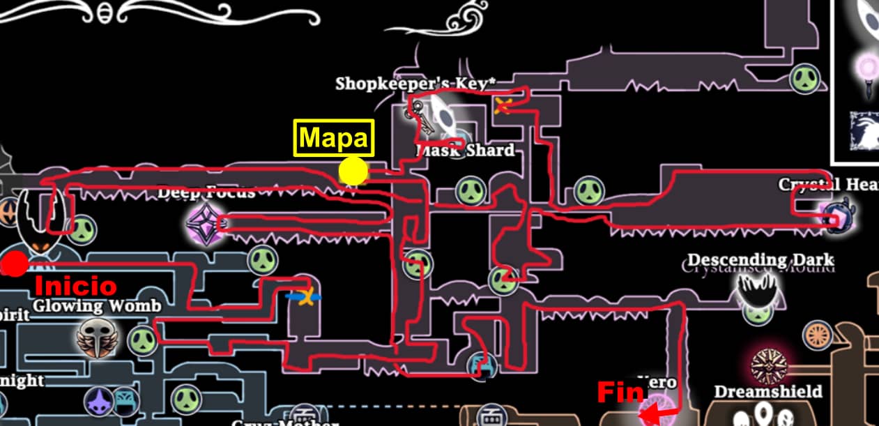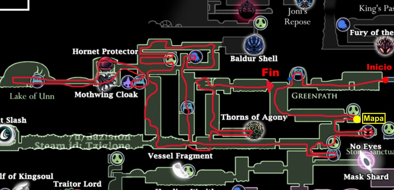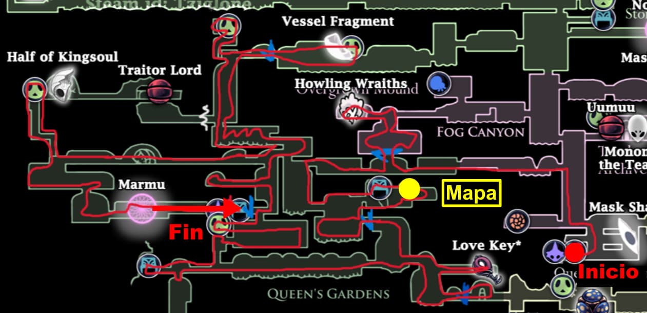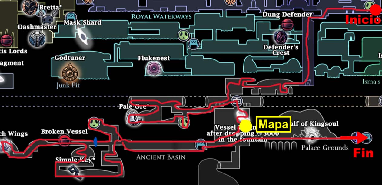 Durante esta travesía vamos a encontrar varios Grubs, fragmentos de mascara e incluso una mejora de habilidad (La Oscuridad descendiente).